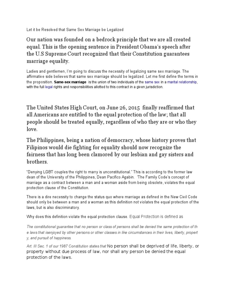 Their concern is that traditional marriages are being devalued by same sex marriages which are swaying people away from being married and instead choosing to live with same sex partners Nagle, It is clear here that such arguments treat marriage as a man-woman union only and are thus not cognizant of the true meaning of marriage.